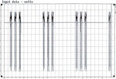 Dit diagram beslaat een periode van 1000 milliseconden = 1 seconde. Elk afzonderlijk signaal wordt hierin slechts als een streepje weergegeven. De frequentiebundels van telkens vier signalen met een pauze zijn op hun beurt weer in groepen van drie bundels geritmeerd.